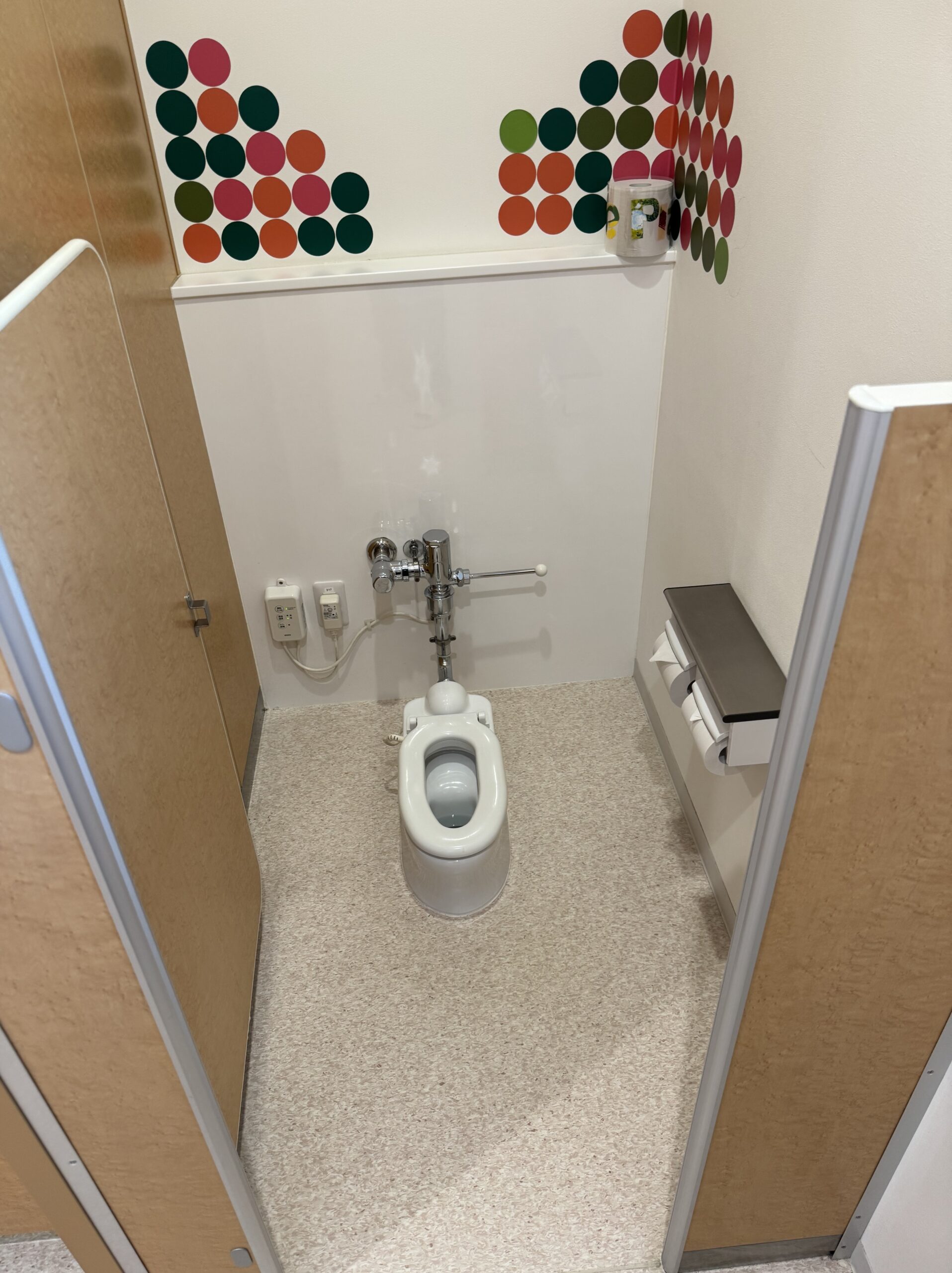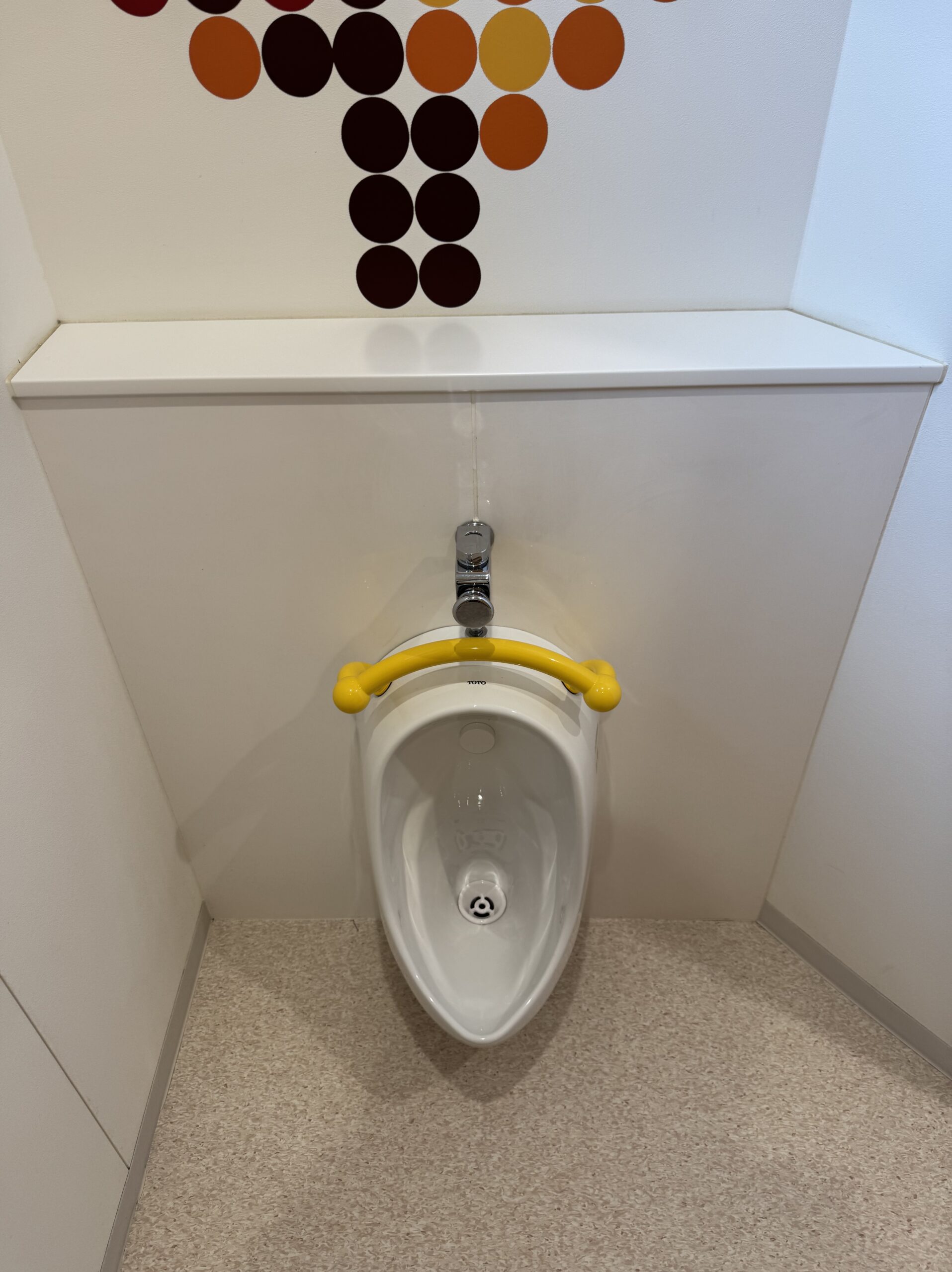 - 女子トイレには黄色の持ち手つき小便器と子ども用便座の個室あり