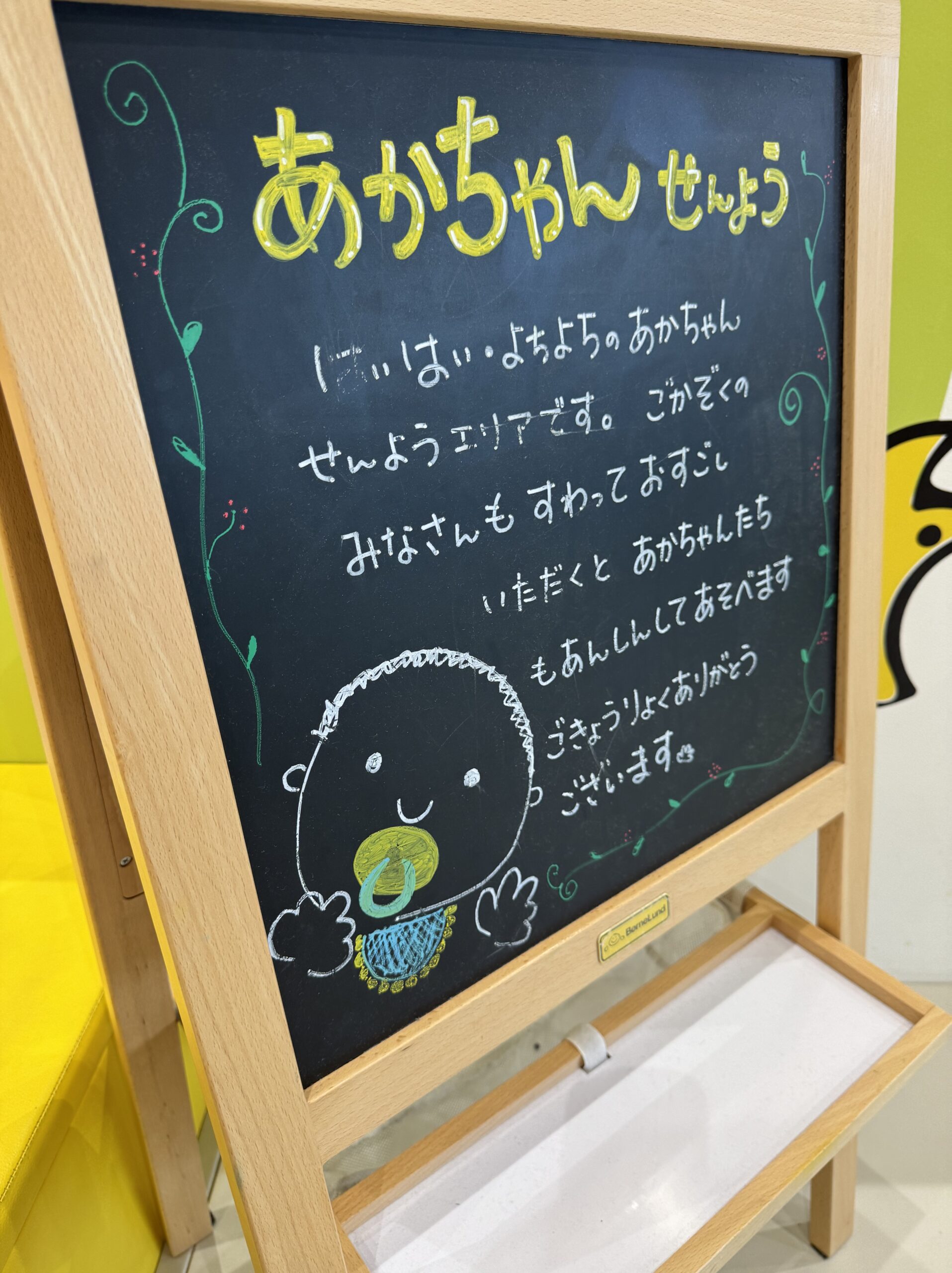 黒板には「ご家族もすわって過ごしてね」との案内もあり、ベビースペース内は全体的にやわらか素材&低めの設備で安心設計。