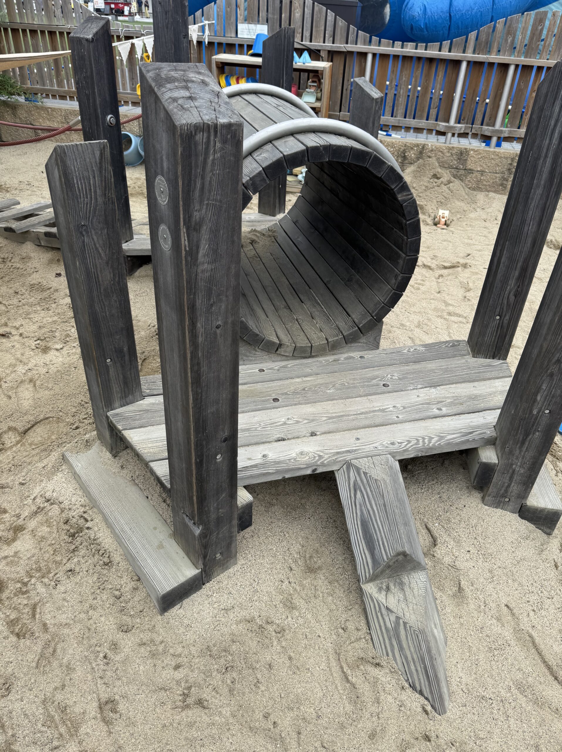 - ロープ渡りやバランス遊びができる木製アスレチック