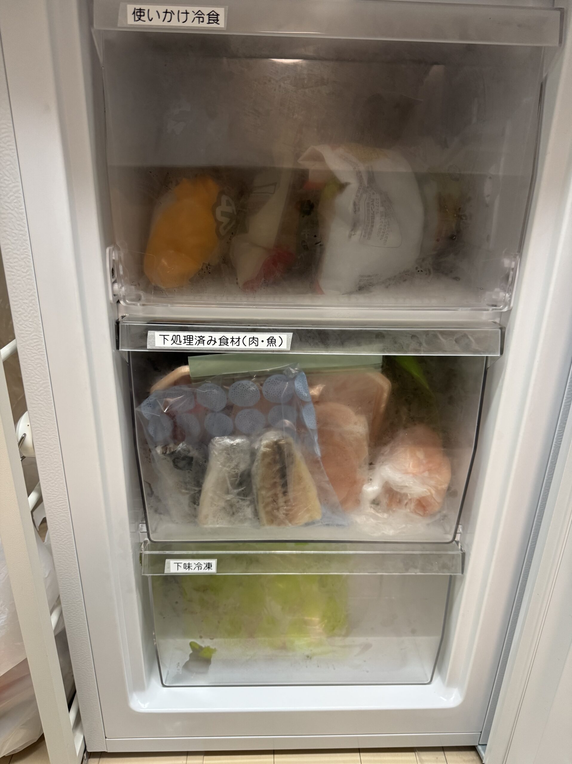 冷凍庫は引き出しごとにラベルを貼ってざっくり分類しています👇